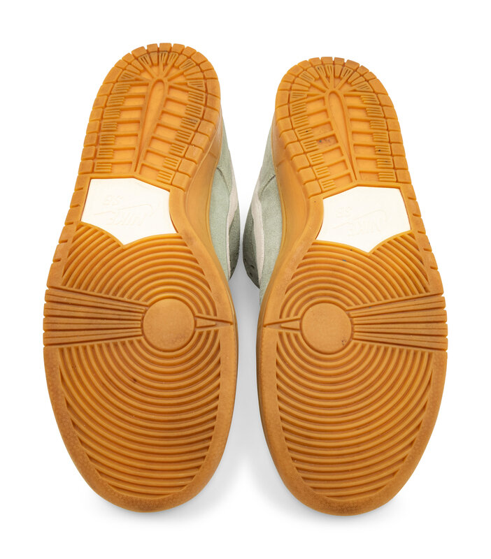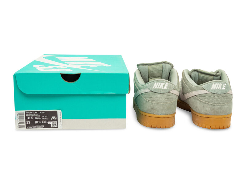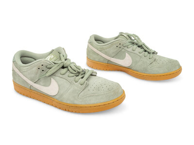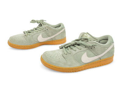 Released 11/20/19, the Nike SB Dunk Low "Horizon Green" features a soft light green suede upper complemented by tonal textile tongues, liners, and laces. Light Ivory accents appear on the Swoosh, tongue label, heel embroidery, and insoles, while a classic gum rubber outsole completes the design. This clean and versatile colorway is favored for both skating and casual wear.
