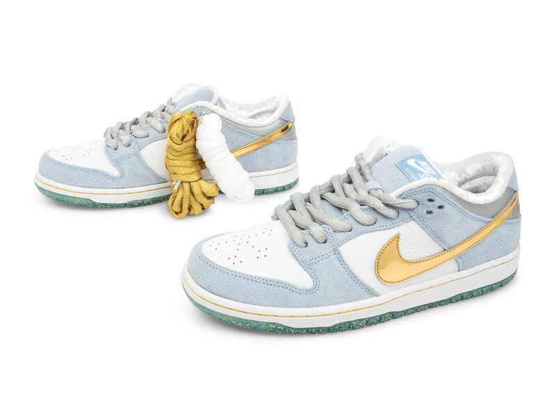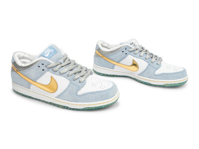 Released 12/19/20, the Nike SB Dunk Low "Holiday Special" was a festive collaboration between Sean Cliver and Nike SB. The design features a white leather base with light blue suede overlays, metallic gold Swooshes, and a glittery icy blue outsole. Notable details include snowflake-shaped perforations on the toe box, plush blue velvet on the tongue and collar lining, and custom insoles with Cliver's signature and holiday-themed graphics.