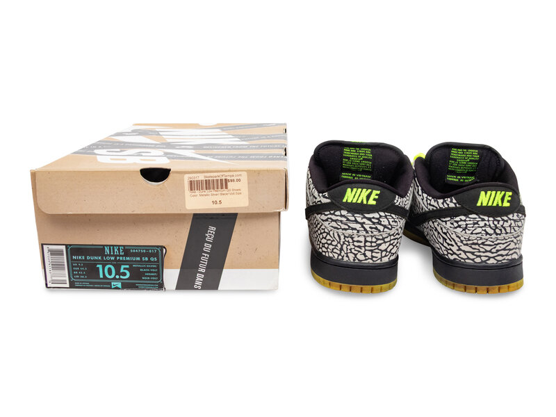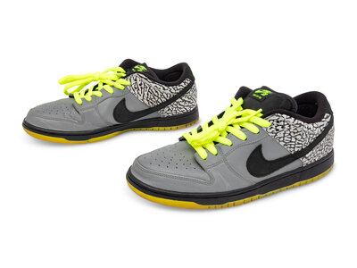 Released on November 29, 2013, the Nike Dunk Low Premium SB QS "DJ Clark Kent 112" is a standout collaboration between DJ Clark Kent and Primitive Skate. This limited-edition sneaker features a matte grey leather upper with a 3M reflective finish that shines in low-light conditions. Black detailing and elephant print overlays on the heel and collar add texture, while vibrant volt green accents on the laces and outsole provide a striking contrast. The shoe is built on a Lunarlon midsole for enhanced comfort, making it both a stylish and functional piece in the Dunk SB lineup.