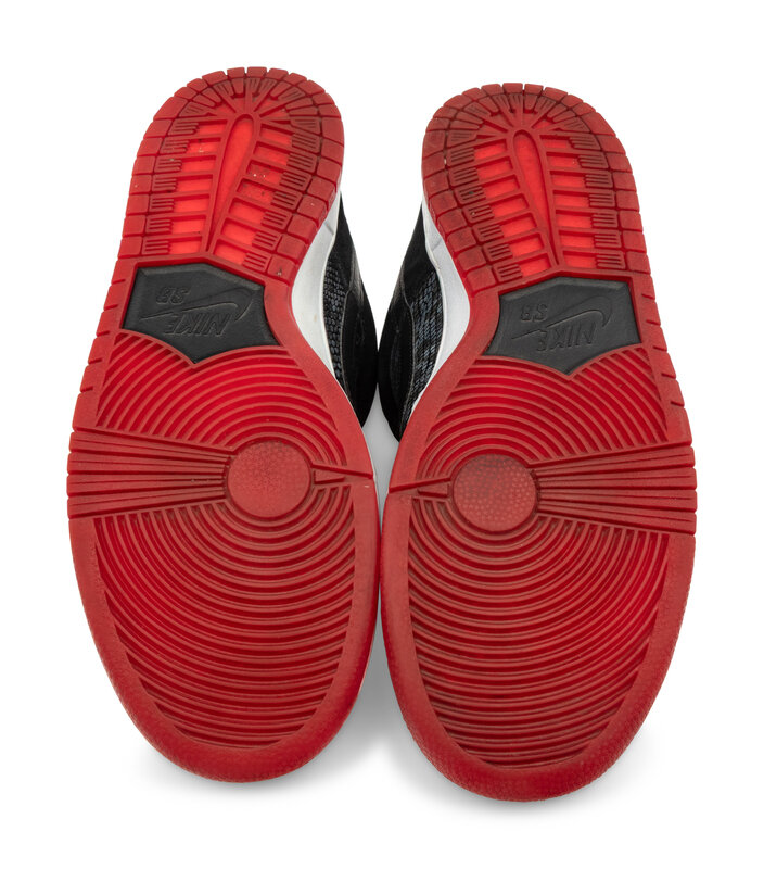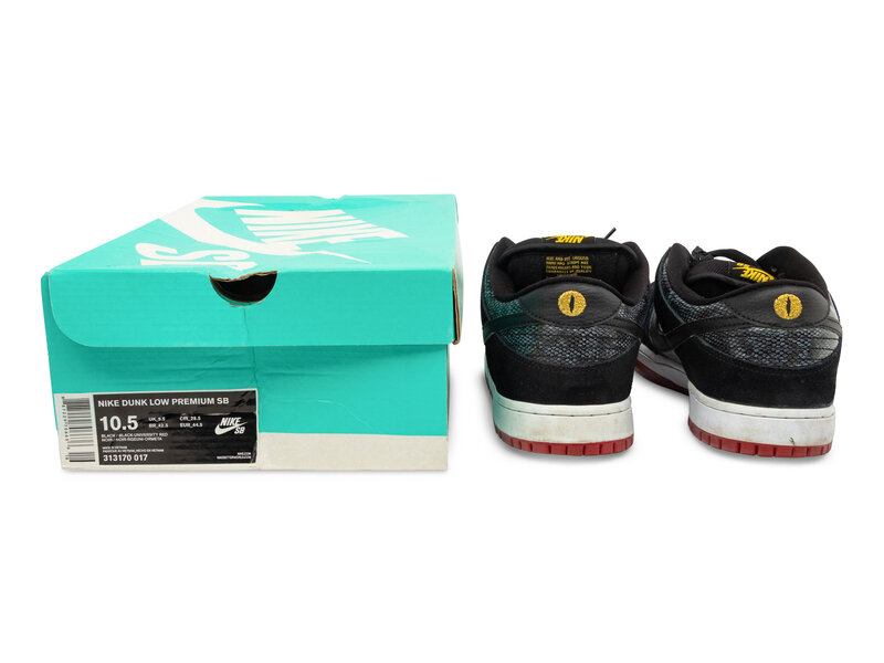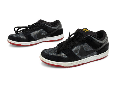 Released on February 13, 2014, the Nike Dunk Low Premium SB "Snakeskin" showcases a sleek black leather upper adorned with reflective snakeskin panels on the toe box and heel. The black Swoosh and red accents, including the heel tab and tongue branding, add a pop of color. Equipped with Zoom Air cushioning in the heel, this skate-ready silhouette combines style with performance.