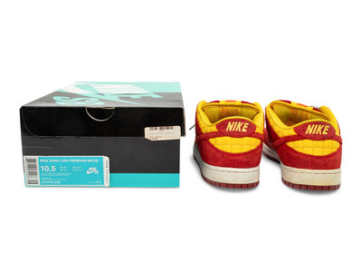 Released on August 23, 2014, the Nike SB Dunk Low Premium QS "Crawfish" is a collaboration with Louisiana's Rukus Board Shop, celebrating the state's iconic crawfish boils. The sneaker features a speckled red suede upper representing crawfish shells, complemented by a metallic silver leather toe box symbolizing the boiling pots. Yellow quilted leather on the heel nods to the corn often included in the boil, while printed newspaper panels on the midfoot mimic the traditional tablecloths used during these gatherings.