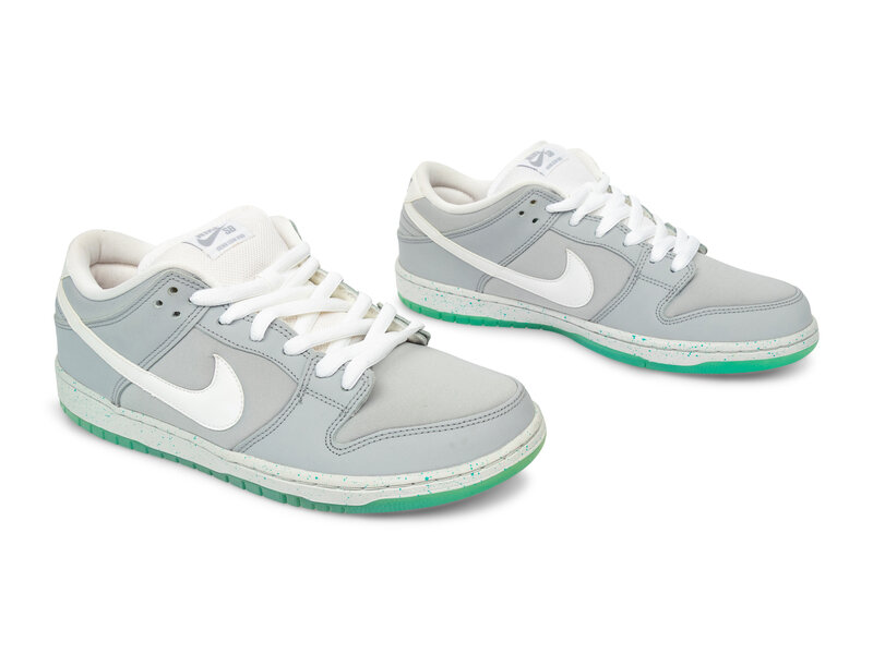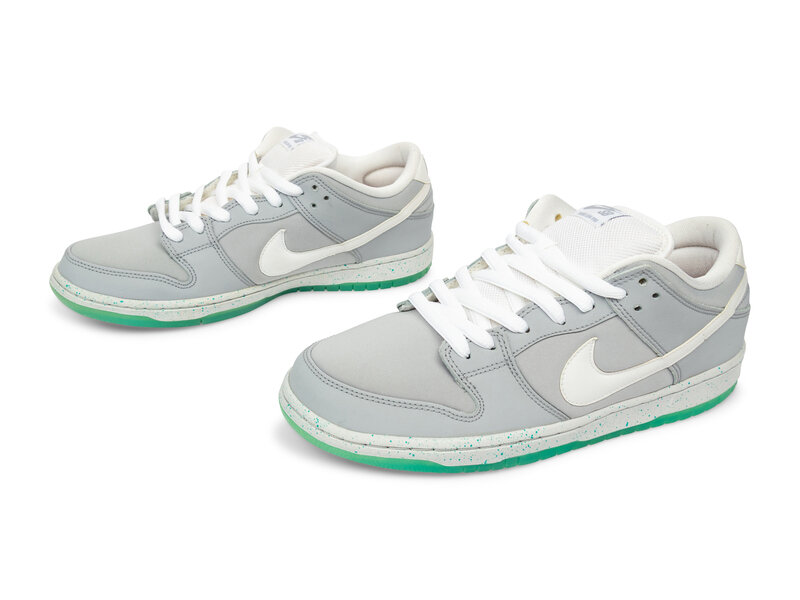 Released on May 22, 2015, the Nike SB Dunk Low "Marty McFly" draws inspiration from Marty McFly's iconic Nike MAG sneakers in Back to the Future Part II. This limited-edition model features a wolf grey suede upper with a white leather Swoosh, complemented by speckled detailing on the midsole and a translucent Light Retro outsole. Inside, the insoles showcase graphics reminiscent of McFly's hoverboard, adding a nostalgic touch to this homage.