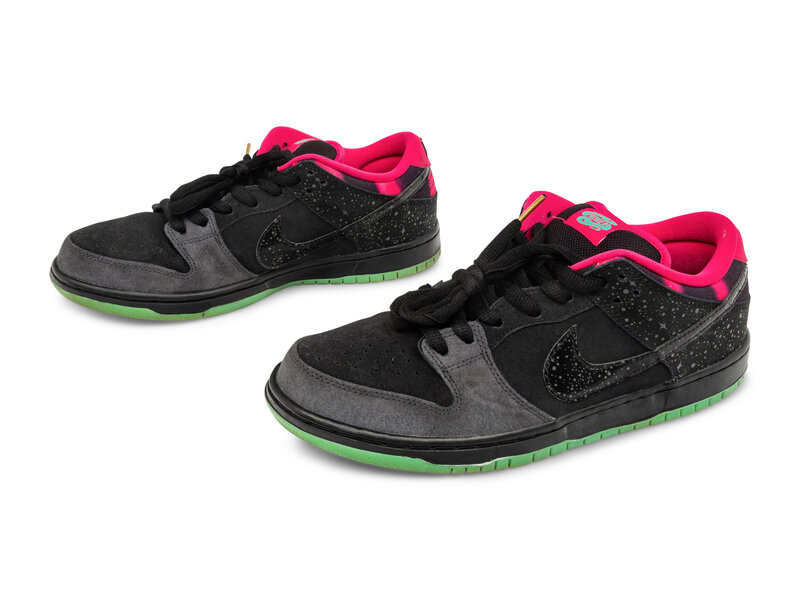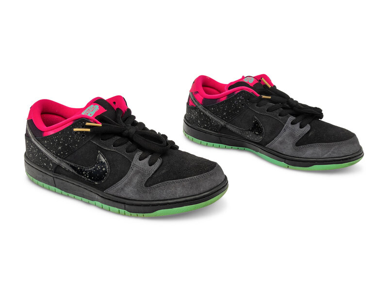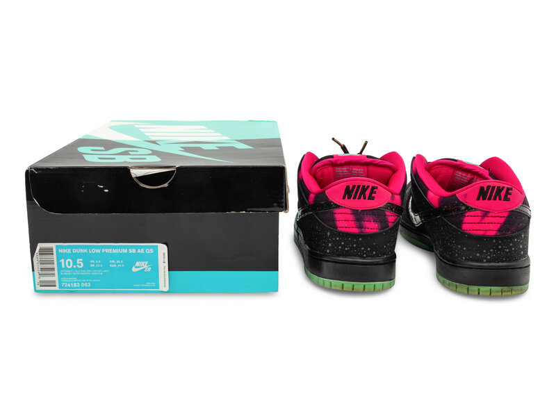 Released 11/22/14, the Premier x Nike SB Dunk Low Premium AE QS "Northern Lights" is a collaboration between Michigan-based skate shop Premier and Nike SB. The design draws inspiration from the Aurora Borealis, featuring a black leather and suede upper with an iridescent Swoosh, glow-in-the-dark outsole, and pink accents on the lining and speckled midsole. The shoe blends skate functionality with eye-catching cosmic flair, making it a standout in the Dunk SB line.