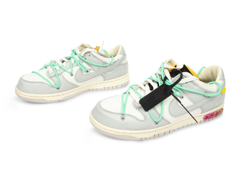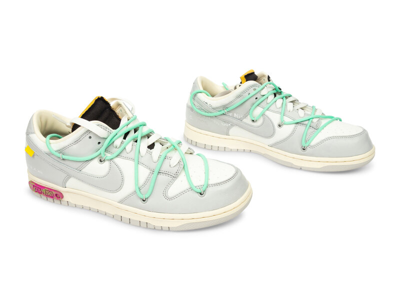 The Off-White x Nike Dunk Low "Lot 04 of 50" released 8/9/21 as part of Virgil Abloh’s massive “Dear Summer” collection, which featured 50 unique takes on the Dunk Low. Lot 04 features a sail leather upper with grey suede overlays, a metallic silver Swoosh, and a blue secondary lacing system. Signature Off-White details include the zip tie, Helvetica text on the medial side, and exposed foam tongue. The number badge on the midsole marks it as Lot 04/50, with the combination of textures and accents making each pair in the collection feel distinct.