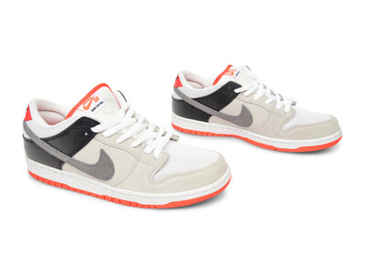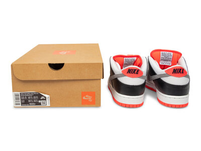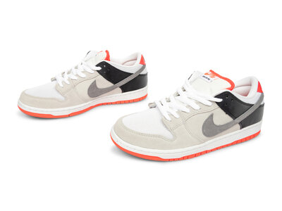 The Nike SB Dunk Low "AM90 Infrared" released 1/20/20, pays tribute to the iconic Air Max 90 “Infrared” colorway. The shoe features a mix of grey suede, black leather, and mesh on the upper, mimicking the materials of the original AM90. Bright infrared accents hit the heel tab, tongue tag, and outsole, while a white midsole and black Swoosh round out the look. This release blends classic running shoe heritage with skateboarding style, making it a standout crossover in Nike’s catalog.