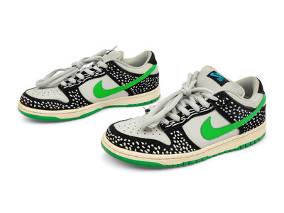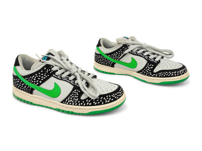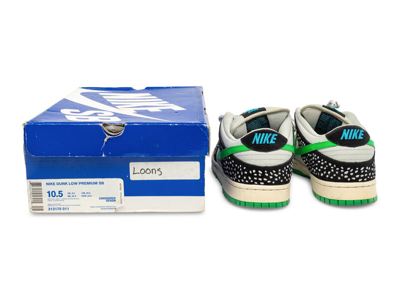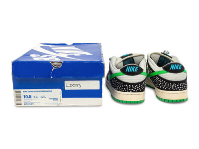 The Nike SB Dunk Low Premium "Loon" released 9/9/10, and takes inspiration from the Minnesota state bird, the common loon. The shoe features a white leather base with black overlays printed with a feather-like pattern, mimicking the loon’s distinctive plumage. Soft green accents on the lining, outsole, and Swoosh add contrast, while a black midsole ties everything together. The result is a unique and nature-inspired Dunk SB with strong regional storytelling.