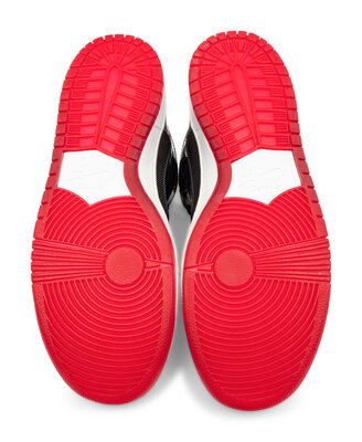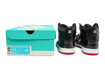 The Nike SB Dunk High "Rivals Pack" released 11/21/18 as part of a two-shoe collection celebrating the rivalry between Nike SB and Jordan Brand, and between New York and Chicago. This particular pair draws inspiration from the Air Jordan 1 "Bred", featuring a black leather upper with red overlays, a white midsole, and red outsole. It mirrors the AJ1’s iconic color blocking but in a high-top Dunk SB silhouette, blending skate heritage with basketball legacy. Bold and nostalgic, it’s a tribute to both sneaker culture and street-level rivalries.