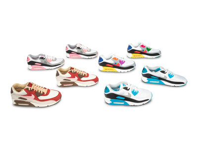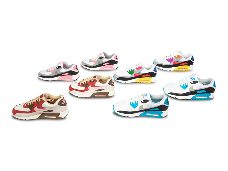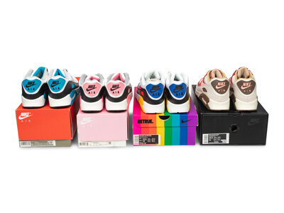 This four-pair set showcases some of the most celebrated Air Max 90 releases in recent years, all in deadstock condition. The Air Max 90 Retro ‘Laser Blue’ (2020) features a crisp white and blue upper with signature 90 detailing, while the Wmns Air Max 90 ‘Rose Pink’ offers a soft, feminine take on the classic silhouette. The Air Max 90 ‘Be True’ delivers bold, rainbow-inspired accents for a fresh look, and the DQM x Air Max 90 ‘Bacon’ (2021) brings a playful, premium collaboration with rich leather and neutral tones. Together, this set highlights the versatility and enduring appeal of the Air Max 90 line.