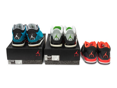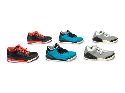 This three-pair collection highlights standout Air Jordan 3 Retro colorways, all in iconic AJ3 styling. The Jordan 3 Retro ‘Chlorophyll’ features a predominantly gray upper with vibrant green accents and classic elephant print detailing. The Jordan 3 Retro ‘Powder Blue’ showcases a soft powder blue upper with complementary accents, creating a clean, fresh look. The Jordan 3 Retro ‘Crimson’ delivers deep red tones contrasted with neutral gray highlights, offering a bold yet timeless design. Together, these pairs demonstrate the versatility and enduring appeal of the Jordan 3 silhouette.