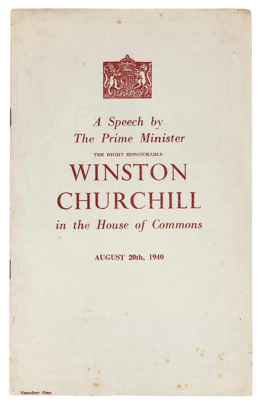 CHURCHILL, Winston (1874-1965). A Speech by the Prime Minister The Right Honourable Winston Churchill in the House of Commons August 20th, 1940. [London: Bayard Press for the Ministry of Information, 1940].