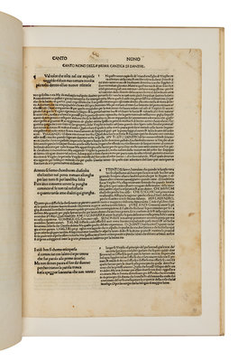 Folio. Title printed within a red border, red initials. [Tipped in:] an original leaf from the 1487 edition of Dante printed by Boninus de Boninis. Original cloth.