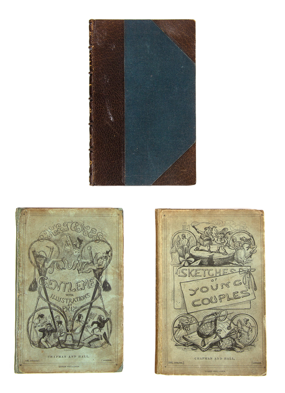 Sketches of Young Gentlemen. London: Chapman and Hall, 1838. Small 8vo. Illustrated by H.K. Browne. (Some spotting and browning.) Original pictorial blue-green boards (rebacked, slightly soiled). FIRST EDITION. Eckel, p. 104-5. -- [DICKENS]. Sketches of Young Couples. London: Chapman and Hall, 1840. Small 8vo. Illustrated by H.K. Browne. Original pictorial blue-green boards (rebacked preserving portion of original spine). FIRST EDITION. Eckel, pp. 106-7. - [DICKENS]. Sunday Under Three Heads. Manchester: Pearson, 1884. Small 8vo. Illustrated. Modern half morocco gilt. Facsimile reprint of Dicken's 1836 work, with "air" (rather than "hair") on p.7.