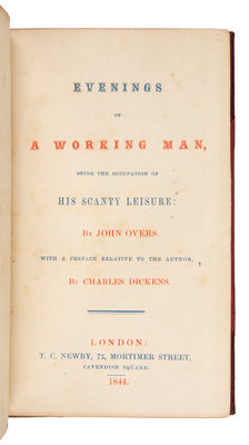 [DICKENS, Charles, contributor]. -- OVERS, John. Evenings of a Working Man, being the Occupation of his Scanty Leisure...with a Preface Relative to the Author. London: T.C. Newby, 1844.