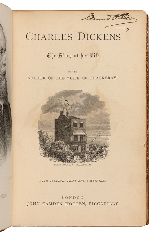 FIRST EDITION, A FINE ASSOCIATION COPY, annotated throughout by Dickens's contemporary and friend, Edmund Ollier. In one such annotation, Ollier recalls: "I recollect my father used to say that Dickens originally intended to make only a short story of "Oliver Twist", but he (my father) recommended him to give it the usual three-volume dimensions. My father was at that time engaged at Bentley's" (p.69). Ollier contributed works to Household Words, and his father knew Dickens while employed by the publisher Richard Bentley. Dickens contributed a serialised edition of Oliver Twist illustrated by George Cruikshank to Bentley's Miscellany, which first appeared in January 1837, and which was an immediate success. Ultimately, Dickens paid Bentley £2,250 to buy out the rest of his contract and to purchase the copyright to Oliver Twist.