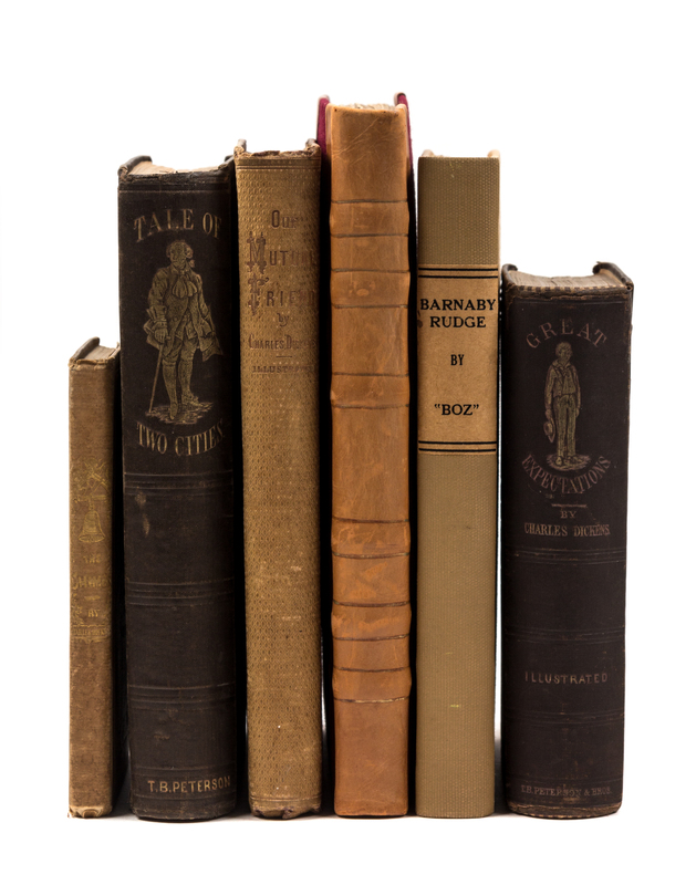 A Tale of Two Cities. Philadelphia: T. B. Peterson and Brothers, 1859. 8vo. Original publisher's brown ribbed cloth (a few discreet spine repairs); cloth folding case. FIRST AMERICAN EDITION, second issue. Smith p.355. -- Great Expectations. Philadelphia: T. B. Peterson and Brothers, [1861]. 8vo. Original publisher's cloth. Smith p.377 ("Illustrated Duodecimo" edition). -- Our Mutual Friend. Philadelphia: T. B. Peterson & Brothers, 1865. 8vo. Original publisher's purple cloth. Smith pp.393-394 ("Peterson Subedition," binding variant A). -- The Chimes, A Goblin Story. Philadelphia: Lea and Blanchard, 1845. Original publisher's tan cloth gilt (some soiling); cloth folding case. Gimbel A88. -- Sketches by Boz. Philadelphia: Lea & Blanchard, 1839. 8vo. Modern half leather. Smith p.18 ("Cloth: 1839" edition). -- Barnaby Rudge. Philadelphia: Lea & Blanchard, 1842. 8vo. Modern cloth-backed boards. -- Condition generally good.