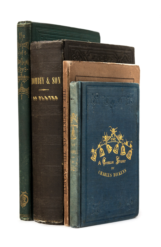 The Cricket on the Hearth. New York: Wiley & Putnam, 1846. 8vo. Original brown printed wrappers (separation at joint, a few small tears to spine); morocco slipcase. One of several American editions, this was published as number LV of Wiley and Putnam's Library of Choice Reading. Provenance: George Barr McCutcheon (bookplate, lot 92 in his 1926 sale). RARE. -- The Chimes: A Goblin Story. Philadelphia: Lea and Blanchard, 1845. 12mo. Publisher's original blue cloth gilt. FIRST AMERICAN EDITION. -- Dombey and Son. Boston: Bradbury and Guild, 1848. 8vo. Publisher's original black ripple-grain cloth, spine gilt; cloth folding case. Smith p. 260-270 ("Bradbury and Guild edition," binding variant B). -- The Mystery of Edwin Drood. Boston: Fields, Osgood, & Co., 1870. 8vo. Publisher's original green cloth, spine gilt (discreet spine repair); cloth slipcase. FIRST EDITION, second issue. Smith p. 413 (binding variant A). -- Condition generally good.