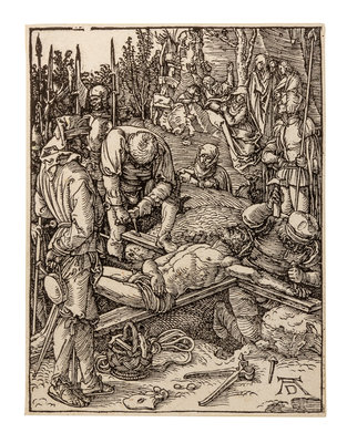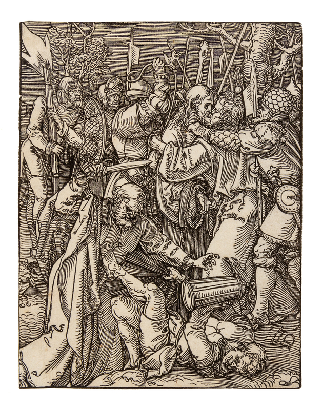 The Nailing to the Cross, ca 1509-1511. 5 x 3 9/16 in. (127 x 98 mm), trimmed to borderline without any loss of subject. From The Small Passion. Bartsch 136; Meder 136. -- The Betrayal of Christ, ca 1509-1511. 5 1/8 x 3 9/16 in. (131 x 100 mm), thin margin. From The Small Passion. Bartsch 39; Meder 148.