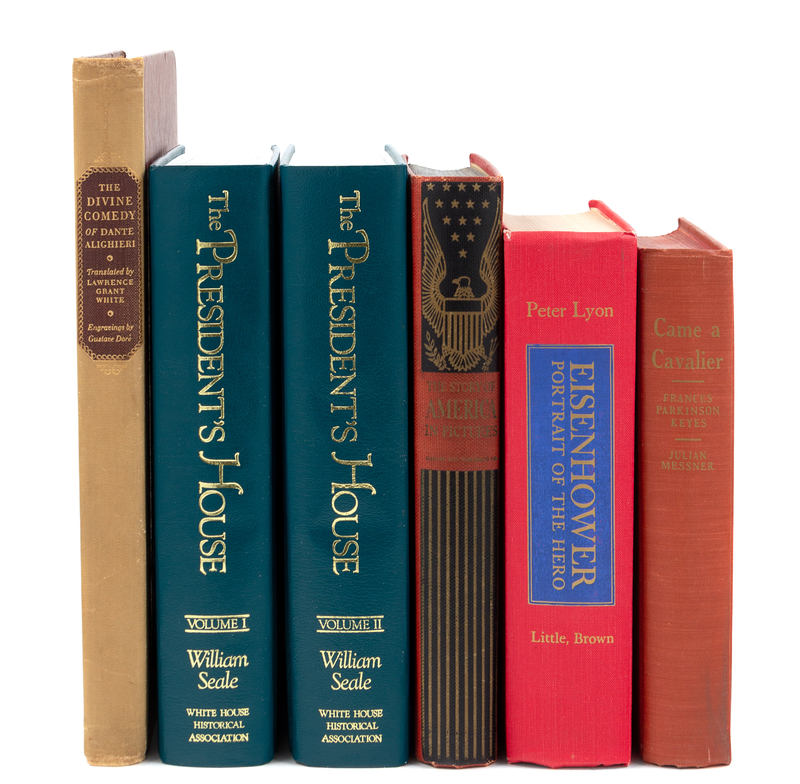 ALIGHIERI, Dante. Lawrence Grant White, translator. The Divine Comedy. New York: Pantheon Books Inc., 1948. -- COLLINS, Allan C. The Story of American in Pictures. Garden City, New York: The Garden City Publishing Co., Inc., 1938. -- KEYES, Frances Parkinson. Came a Cavalier. New York: Julian Messner, Inc., 1947. -- LYON, Peter. Eisenhower: Portrait of the Hero. Boston, Toronto: Little, Brown and Company, 1974. -- SEALE, William. The President's House: A History. Washington D.C.: White House Historical Association, 1986. 2 volumes. -- And 4 others. Together, 9 works in 10 volumes, all in original publisher's cloth or leather, condition generally fine, complete list available on request.