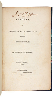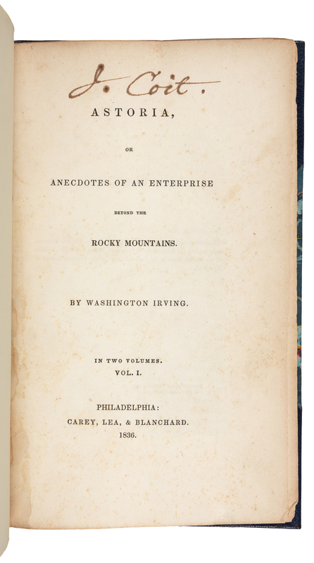 IRVING, Washington (1783-1859). Astoria, or Anecdotes of an Enterprise beyond the Rocky Mountains. Philadelphia: Carey, Lea, & Blanchard, 1836.