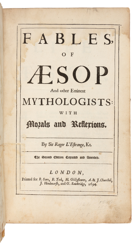 AESOP (c. 620-560 B.C.) -- L'ESTRANGE, Roger, Sir (1616-1704), translator. Fables of Aesop and other Eminent Mythologists: With Morals and Reflexions. London: R. Sare, B. Took, M. Gillyflower, A. & J. Churchil, J. Hindmarsh, and G. Sawbridge, 1694.
