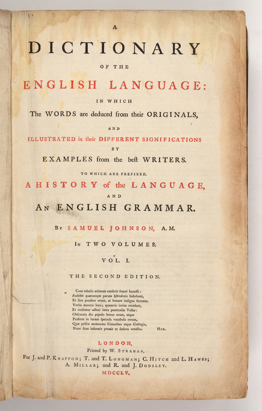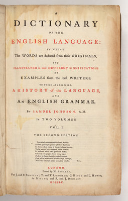 JOHNSON, Samuel (1709-1784). A Dictionary of the English Language. London: W. Strahan for J. and P. Knapton and others, 1755-1756.
