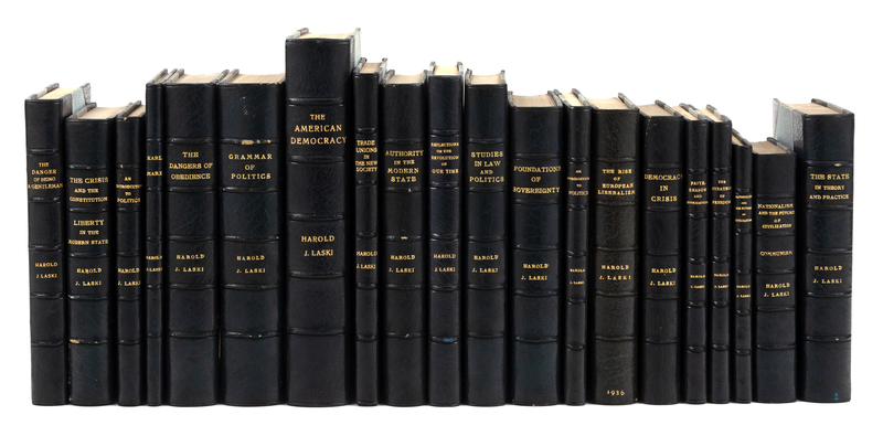 Authority in the Modern State. New Haven: Yale University Press, 1919. -- The Dangers of Obedience & Other Essays. New York and London: Harper & Brothers, 1930. -- Studies in Law and Politics. London: George Allen & Unwin Ltd., 1932. -- The State in Theory and Practice. London: George Allen & Unwin Ltd., 1935. INSCRIBED BY LASKE, 26 November, 1935. -- The American Democracy. London: George Allen and Unwin, Ltd., 1949. -- And 15 others. Together, 21 works in 22 volumes, most first editions, all but two bound in half blue morocco gilt, top edge gilt, condition generally fine, complete list available on request.