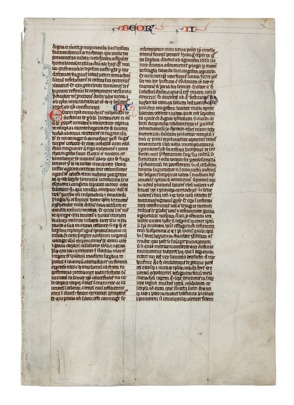 Lettered on two sides, 8vo (212 x 148 mm). 49 lines, double column, written in gothic script, on vellum, red and blue marginalia, red and blue 2-line initials, rubricated chapter numbers, headline in red and blue. Includes text from II Maccabees 8:33-10:30. Matted.