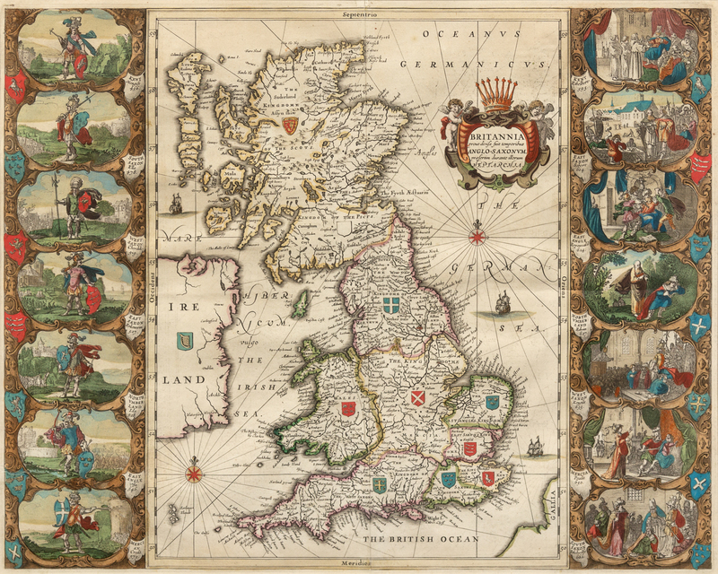 Engraved map of Britain with hand-coloring, text on verso in Latin, visible area 16 7/8 x 21 1/8 (430 x 537 mm), matted and framed (not examined out of frame). Wide side borders decorated with 14 historiated scenes of the Saxon kingdoms including the shield of each kingdom.