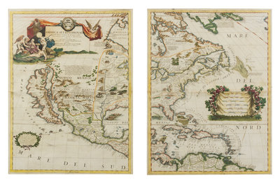 Engraved map of North America on 2 sheets, hand-colored in outline, sheets each approximately 18 3/16 x 24 1/16 in. (462 x 612 mm). Figural cartouche with arms of the dedicatee, Bishop F. Antonio Marsily, decorative cartouches, vignettes of Native American life, matted and framed (small portion of mat adhered to outer margin of one sheet).
