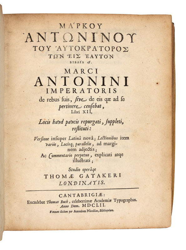 MARCUS AURELIUS ANTONINUS (121-180). Markou Antoninou tou autokratoros ton eis heauton biblia 12. = Marci Antonini imperatoris de rebus suis, sive de eis qæ ad se pertinere censebat, libri XII... Cambridge: Thomas Buck for Anthony Nicolson, 1652.