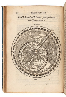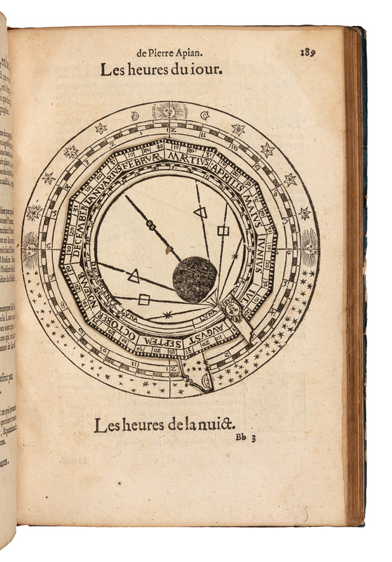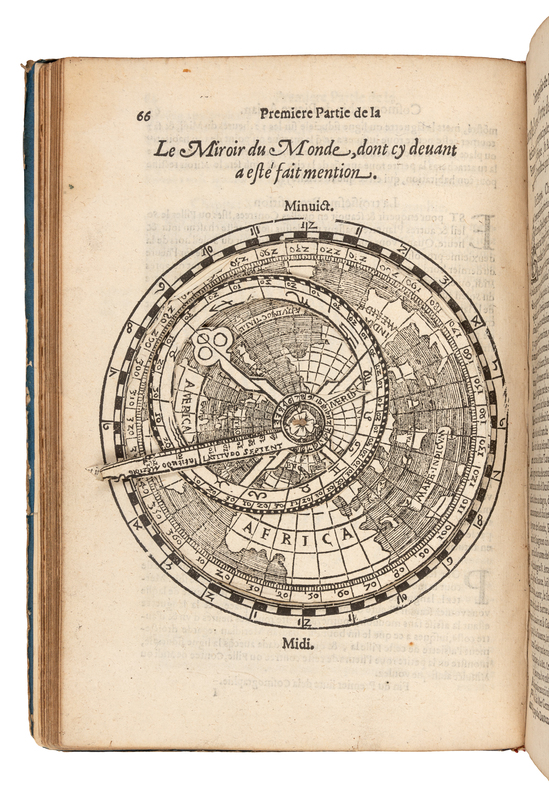 4to (226 x 156 mm). Title with large woodcut of globe, 4 woodcut volvelles on C2v, D1v, I1v and 2B3r, folding double-page world map (lower margin slightly trimmed and a little frayed affecting a few words), numerous woodcut astronomical and geographical text illustrations and diagrams in text. (Lacking string pointer on woodcut page 22 [C3v], several volvelle parts curled or slightly loose, some minor marginal worming on some early upper fore-corners at beginning, some pale marginal dampstaining on upper fore-corners [heavier at end], one margin shaved slightly affecting pagination and woodcut border on H1.) Late 19th-century cloth-backed boards (a few tears on upper cover, a little wear). Provenance: Donald E. Roy (bookplate).