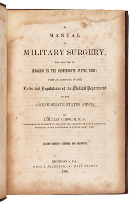 CHISOLM, John Julian. A Manual of Military Surgery for the Use of Surgeons in the Confederate States Army. Richmond: West & Johnston, 1862.