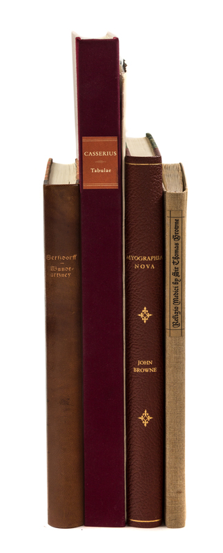 BROWNE, John.Religio Medici. Eugene, OR: University of Oregon for Members of The Limited Editions Club, 1939. -- BROWNE, John. Myographia Nova. New York: Rapoport Printing Corp. for members of Editions Medicina Rara, n.d. (20th-century). LIMITED EDITION, number 1787 of 2500 copies. -- CASSERIUS, Julius. Tabulae Anatomicae de Formato Foetu Tabulae. West Germany: Druckerei Holzer for members of Editions Medicina Rara, n.d. (20th-century). LIMITED EDITION, number 1132 of 2500 copies -- GERSDORFF, Hans von. Feldtbuch der Wundartzney. West Germany: Druckerei Holzer for members of Editions Medicina Rara, n.d. (20th-century). LIMITED EDITION, number 1007 of 2500 copies -- ALBINUS, Bernard Siegfried. Tabulae sceleti et musculorum corporis humani. Northridge, California: Riker Laboratories, n.d. (20th-century). -- Provenance: Abel Berland (his bookplate or a note indicating his gift). All in original publisher's bindings, some with slipcases. Condition generally fine.