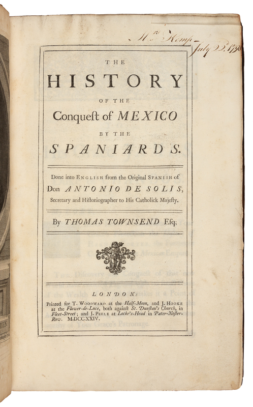 SOLIS Y RIBADENEYRA, Antonio de (1610-1686). The History of the Conquest of Mexico.... London: for T. Woodward, J. Hooke and J. Peele, 1724.