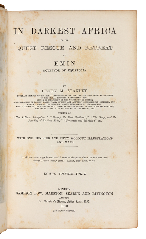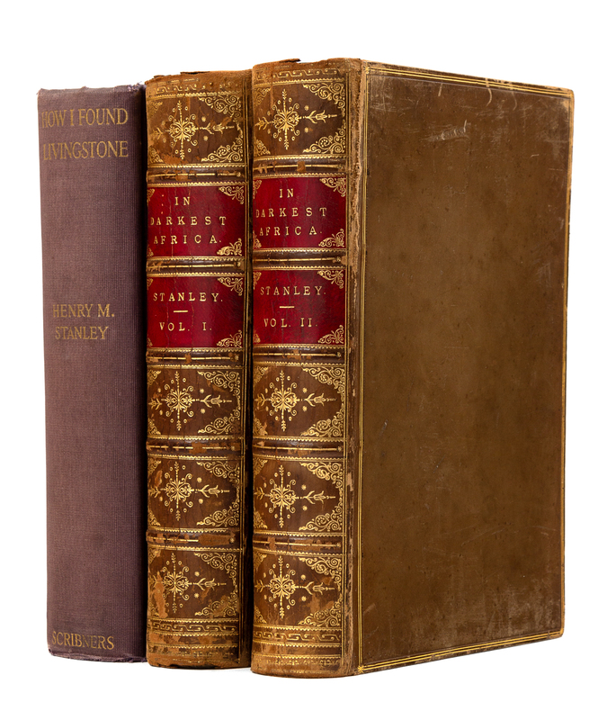 FIRST EDITION, recounting Stanley's expedition to rescue Emin Pasha, the German-born Egyptian governor of Equatoria on the upper Nile. [With:] STANLEY, Henry Morton, Sir. How I Found Livingstone. New York: Charles Scribner's Sons, 1913. The "Centenary Edition." -- PARK, Mungo (1771-1806). Travels in the Interior Districts of Africa. London: W. Bulmer for G. and W. Nichol, 1800. 8vo. Engraved frontispiece portrait, 5 engraved plates. (Lacking engraved folding map.)