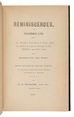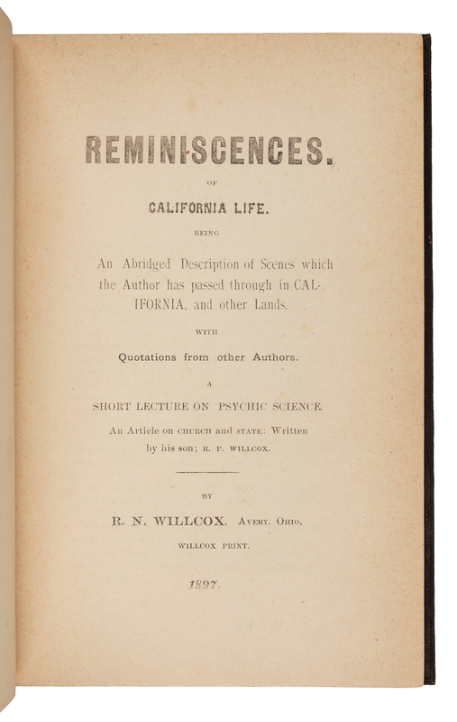 WILLCOX, R. N. Reminiscences of California Life… Avery, OH: Willcox Print, 1897.