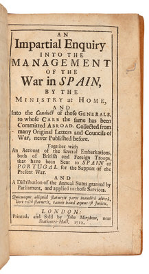 [WAR OF THE SPANISH SUCCESSION]. [BLADEN, Martin (1680-1745)]. An Impartial Enquiry into the Management of the War in Spain. London: John Morphew, 1712.