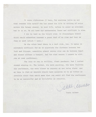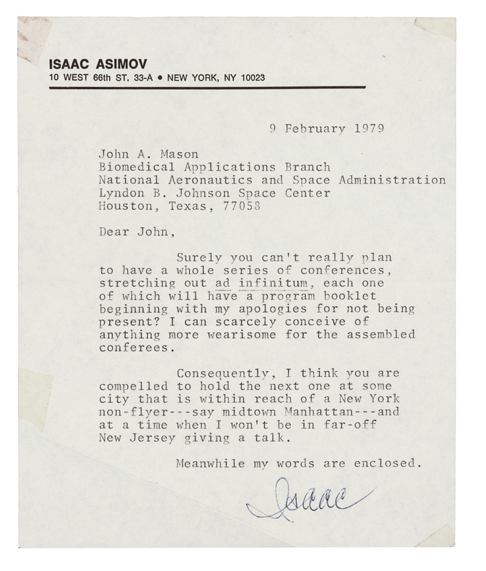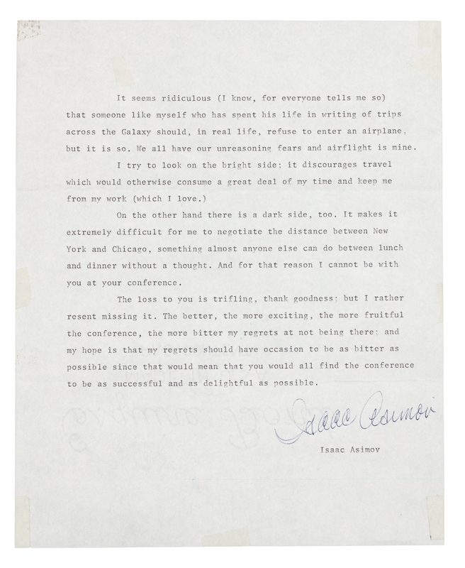 Autograph letter signed ("Isaac"), to John A. Mason. New York, 9 February 1979. 1 page, 8vo., on Asimov's personal stationery, with tape on three corners. Asimove responds that he cannot attend conference ("Surely you can't really plan to have a whole series of conferences, stretching out ad infinitum, each one of which will have a program booklet beginning with my apologies for not being present? I can scarcely conceive of anything more wearisome for the assembled conferees."), and enclosing his remarks. [See next item.] -- Document signed ("Isaac Asimov"). N.d. 1 page, 4to, creased at folds, with tape on 4 corners and top right of page. Asimov explains to conference attendees why he cannot attend. ("It seems ridiculous (I know, for everyone tells me so) that someone like myself who has spent his life in writing of trips across the Galaxy should, in real life, refuse to enter an airplane, but it is so. We all have our unreasoning fears and airflight is mine.")