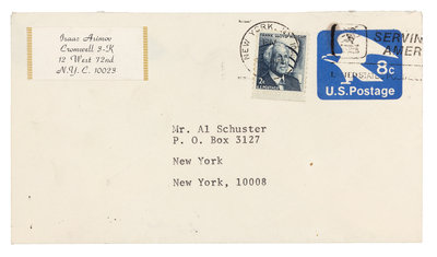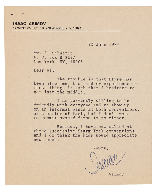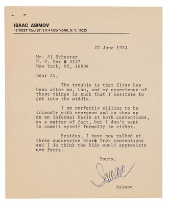 Autograph letter signed ("Isaac"), to Al Schuster. New York, 22 June 1974. With original addressed envelope from the author. 1 page, 8vo., on Asimov's personal stationery. Asimov writes to Al Schuster declining making another appearance at a Star Trek convention. ("I have now talked at three successive Star Trek conventions and I do think the kids would appreciate new faces.")