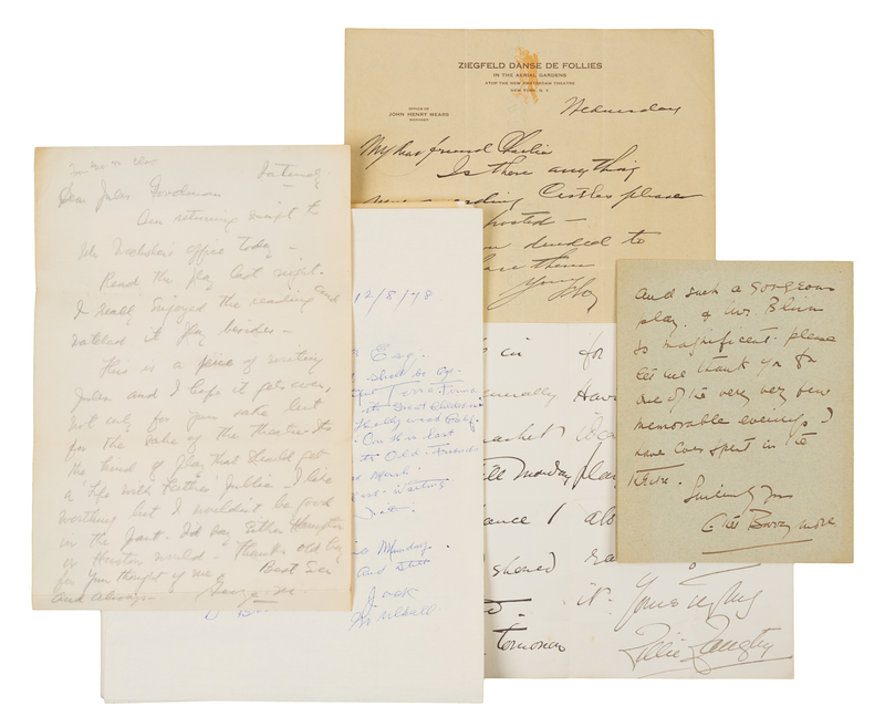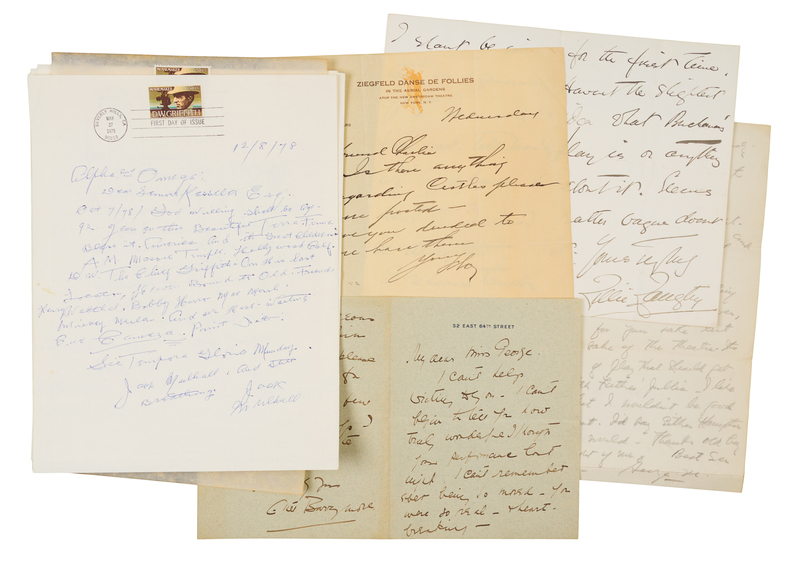 GRIFFITH, D.W. (1875-1948). An archive of tributes. 8 pages, 4to, each bearing the 10-cent D.W. Griffith stamp, postmarked "Beverly Hills, California, May 27, 1975, First Day of Issue", each sheet with a tribute to the movie pioneer by an actor or actress. Comprising tributes from: Lillian Gish (who spearheaded the campaign to have the USPS issue a stamp in Griffith's honor), Jimmy Stewart, Helen Hayes, Blanche Sweet, and others. -- LANGTRY, Lillie (1852-1892). Autographed letter signed ("Lillie"), to Mr. Rose, n.p., n.d. 3 pages, 8vo, bifolium, on 21 Pont Street stationery, creased, a few pale stains. "I rehearse tomorrow for the first time. Haven't the slightest idea what Buchanan's play is or anything about it." -- SULLIVAN, Ed (1901-1975). Autograph letter signed ("Ed") to Frank Sinatra. New York City, 28 August 1973. 1 page, 8vo, with original airmail stamped envelope addressed by Sullivan to Sinatra at the Friars Club, pinholes upper left corner. Sullivan tells Sinatra that he will mention Milton Berle in his Friday October 12th column including Berle's victories in "Charlie Chaplin contests." -- ZIEGFELD, Florenz (1869-1932). Autograph letter signed ("Flo"), to theater owner Charles B. Dillingham, New York, n.d. ("Wednesday"). 1 page, 4to, on Ziegfeld Danse de Follies stationery, light ink transfer and minor staining to lower blank margin. "Is there anything more...please keep me posted."