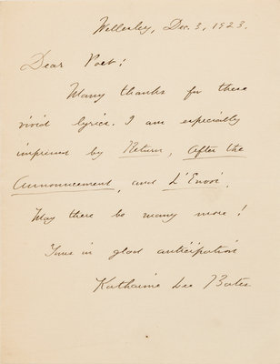 BATES, Katharine Lee (1859-1929). Autograph letter signed ("Katharine Lee Bates"), to an unnamed "Dear Poet." Wellesley, 3 December 1923. 1 page, 8vo, tiny stain in lower blank margin. Bates thanks the recipient for the "vivid lyrics." From the author of "America the Beautiful." -- COPLAND, Aaron (1900-1990). Autograph note signed ("Aaron"), to Renée. Ossining, New York, n.d. [27 November 1954]. 1 page, oblong 12mo, on personal correspondence card. -- HEUSEN, James Van (1913-1990). Autograph musical quotation signed and inscribed ("James Van Heusen"), to Linda Gaye Moody. N.p., n.d. 1 page, 4to, 10 bars on printed staves with lyrics from "It Could Happen to You", small clear mounting corners to blank area. -- PORTER, Cole (1891-1964). Autograph letter signed ("C.P."), to Mrs. Smith, [Lisbon], 20 April 1955. 1 page, 12mo, on Avis Hotel memo paper, small tear with old tape repair top margin, docketed in another hand. "I believe the title has an A in it." Porter requests a book by Richard Aldrich about his marriage with Gertrude Lawrence.