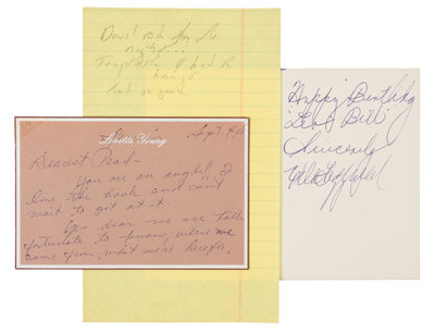 CHEVALIER, Maurice (1888-1972). Autograph letter signed ("Maurice Chevalier"), to his agent Don, Taormina, 29 March 1961. 2 pages, 4to, on Hotel Mediterraneo stationery, lightly creased, a few pale stains, small clear mounting corners to blank area. "Thanks for the good news about the Crosby Show. After the Gershwin one, it is fine. It gives me courage and confidence...All that philosophy - mixed with a simple and effective showmanship - should be constructive and would make me proud to have become that man." --FITZGERALD, Ella (1917-1996). Autograph note signed ("Ella Fitzgerald"), to Leo Bell, n.p., n.d. 1 page, 8vo, in a printed birthday card, small clear mounting corners to blank area. Fitzgerald wishes the recipient a Happy Birthday. -- SPRINGSTEEN, Bruce (b. 1949). Autograph manuscript, lyrics to a song, n.p., n.d. 1 page, 8vo, five lines. In full: "Devil rode by the night…Temptation I had to have it look so good." -- YOUNG, Loretta (1913-2000). Autograph note signed, to Pearl Bailey, n.p., 4 September 1968. 2 pages, oblong 12mo, on personal notecard. "Yes dear we are both fortunate to know, where we came from, what we're here for, and where we're going. Straight into His loving arms…Without this knowledge I would surly [sic] have drowned years ago."