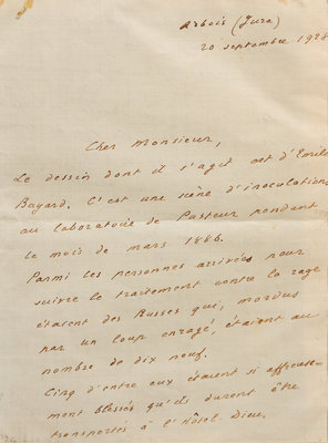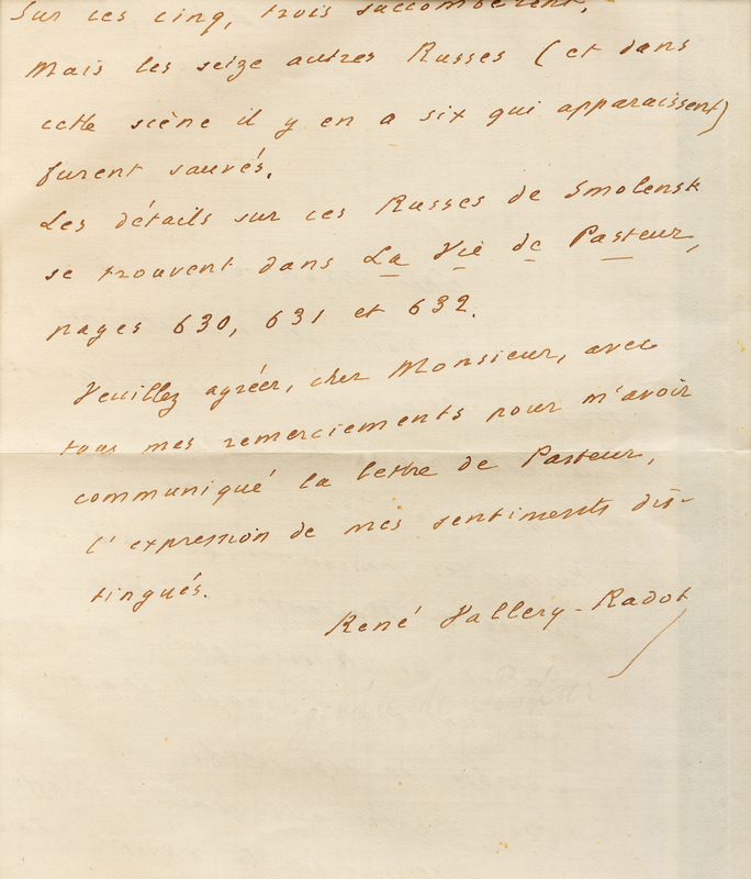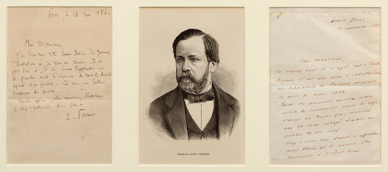 [Framed with:] VALERY-RADOT, René (1853-1933). Autograph letter signed ("René Valery-Radot"), in French. Arbois, Jura, 20 September 1928. 2 pages, 8vo, mounting strips in extreme margins, a few pale stains. Radot, Pasteur's son-in-law, writes the recipient about Pasteur's care of a group of Russians who were bitten by a rabid wolf. Pasteur's inoculation proved effective, and of the 19 afflicted men, 16 survived. Radot refers the recipient to pages 630-632 of his work La Vie de Pasteur, published in 1911.