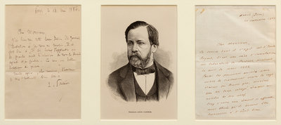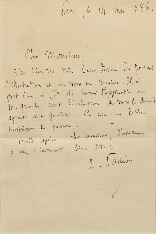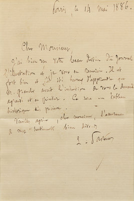 1 page, 8vo, small tape repair, matted and framed (not examined out of frame). Pasteur sends his appreciation of an illustration by A. Gerardin, which appeared in L'Illustration, Journal Universel (presumably the illustration of Russians under Pasteur's care, which was published 27 March 1886, No. 2248, Vol. LXXXVII).