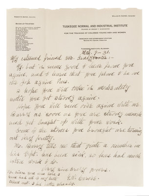 CARVER, George Washington (1864-1943). Autograph letter signed ("G.W. Carver"), to Mr. Grady Porter of the Tom Huston Peanut Company. Tuskegee Institute, Alabama, 9 March 1931. 1 page, 4to, on Tuskegee Normal and Industrial Institute stationery, a few minor folds, one touching the "r" in the signature. "My, but it seems good to hear from you again…P.S. Since you were here I have had all of my teeth taken out. I feel better already." -- WASHINGTON, Booker T. (1856-1915). Autograph letter signed ("Booker T. Washington"), to Mr. Curtis H. Petit. Tuskegee, Alabama, 23 September 1904. 1 page, 4to, on The Tuskegee Normal and Industrial Institute stationery. Washington solicits a donation from the recipient for the school's endowment. -- WASHINGTON, Margaret Murray (1865-1925). Autograph letter signed ("Mrs. Booker T. Washington"), to Mrs. Sergeant. Tuskegee, Alabama, n.d. 2 pages, 8vo, on The Oaks, Tuskegee stationery, mounting remnants upper margin, creased. Apologizing for the delayed check and receipt. -- HEARST, William Randolph (1863-1951). Autograph letter signed ("WR"), to Charles. N.p., n.d. 1 page, 12mo postcard. In full: "My dear Charles, you are wrong. I would rather have the gift and I will go around to Cartier's in the morning and select it." [With:] Autographed note signed ("Charlie") to Hearst. 1 page, oblong 12mo, on Ritz-Carlton Hotel notepaper.