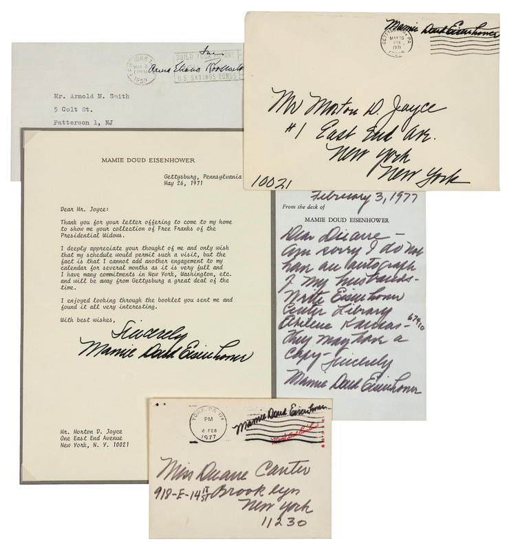 EISENHOWER, Mamie. Free Frank signature ("Mamie Doud Eisenhower"), on envelope, to Morton Dean Joyce, New York, New York, postmarked Gettysburg PA, 26 May 1971. With typed letter signed ("Mamie Doud Eisenhower"), to Mr. Joyce, mentioning his collection of free franks of Presidential widows. -- EISENHOWER, Mamie. Free Frank signature ("Mamie Doud Eisenhower"), on envelope above a red machine-printed facsimile frank, to Miss Duane Canter, Brooklyn, NY, postmarked York, PA, 4 February 1977. With original an autograph note signed enclosure ("Mamie Doud Eisenhower") to Diane, 3 February 1977. -- ROOSEVELT, Eleanor. Free Frank signature ("Free Anna Eleanor Roosevelt"), on envelope, to Mr. Arnold Smith, Paterson, NJ, postmarked New York, 3 May 1959. -- ROOSEVELT, Eleanor. Two typed letters signed ("Eleanor Roosevelt"), to Mr. Smith, New York, NY, February 11 and February 24, 1960. Each 1 page, 8vo, on personal stationery. Roosevelt twice declines a request to send a franking signature omitting the word "Free." -- TRUMAN, Bess. Typed note signed ("Bess Truman"), to Mr. Smith, Independence, Missouri, 6 September 1979. 1 page, 8vo, on blind embossed personal stationery. -- Together 8 items.
