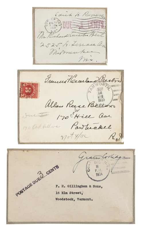 COOLIDGE, Grace (1879-1957). "Grace Coolidge," on an envelope stamped "Postage Due 3 Cents," to F. H. Gillingham & Sons, 8 December 1934. -- PRESTON, Frances Cleveland (1864-1947). "Frances F. Cleveland Preston," on an envelope, to Allan Reese Bellow, 12 September 1935. -- ROOSEVELT, Edith (1861-1948). "Edith K. Roosevelt," on an envelope, to Mr. Richard Lincoln Neel, 11 August 1931.