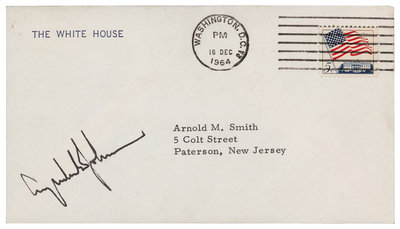 JOHNSON, Lyndon Baines (1908-1973), President. Signature ("Lyndon B. Johnson"), as President. To Mr. Arnold Smith, Paterson, NJ, postmarked Washington D. C., 16 December 1964.