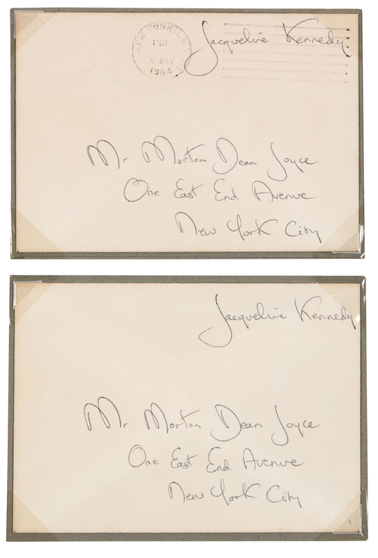 [With:] KENNEDY, Jacqueline. Signature ("Jacqueline Kennedy"), on an uncancelled envelope. To Mr. Morton Dean Joyce.
