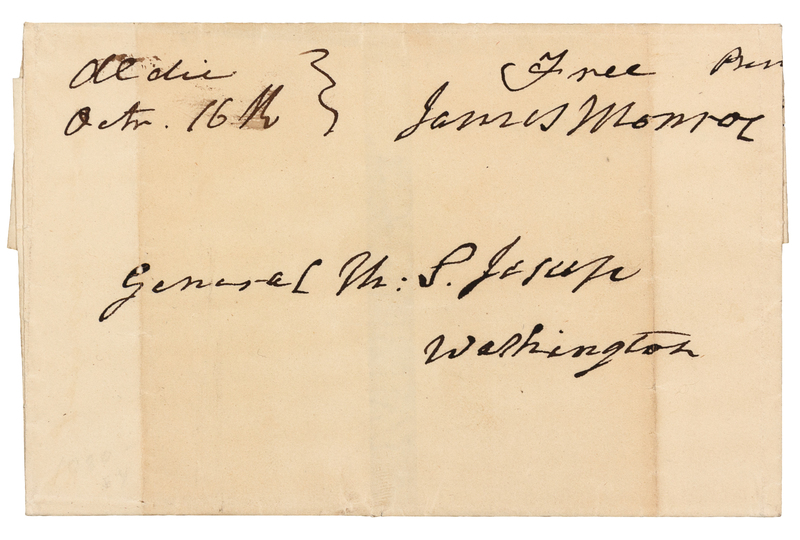 MONROE, James (1758-1831), President. Autograph free frank ("Free James Monroe"), on folded cover addressed in his hand. To General Thomas S. Jesup, Washington, D.C., 1827.
